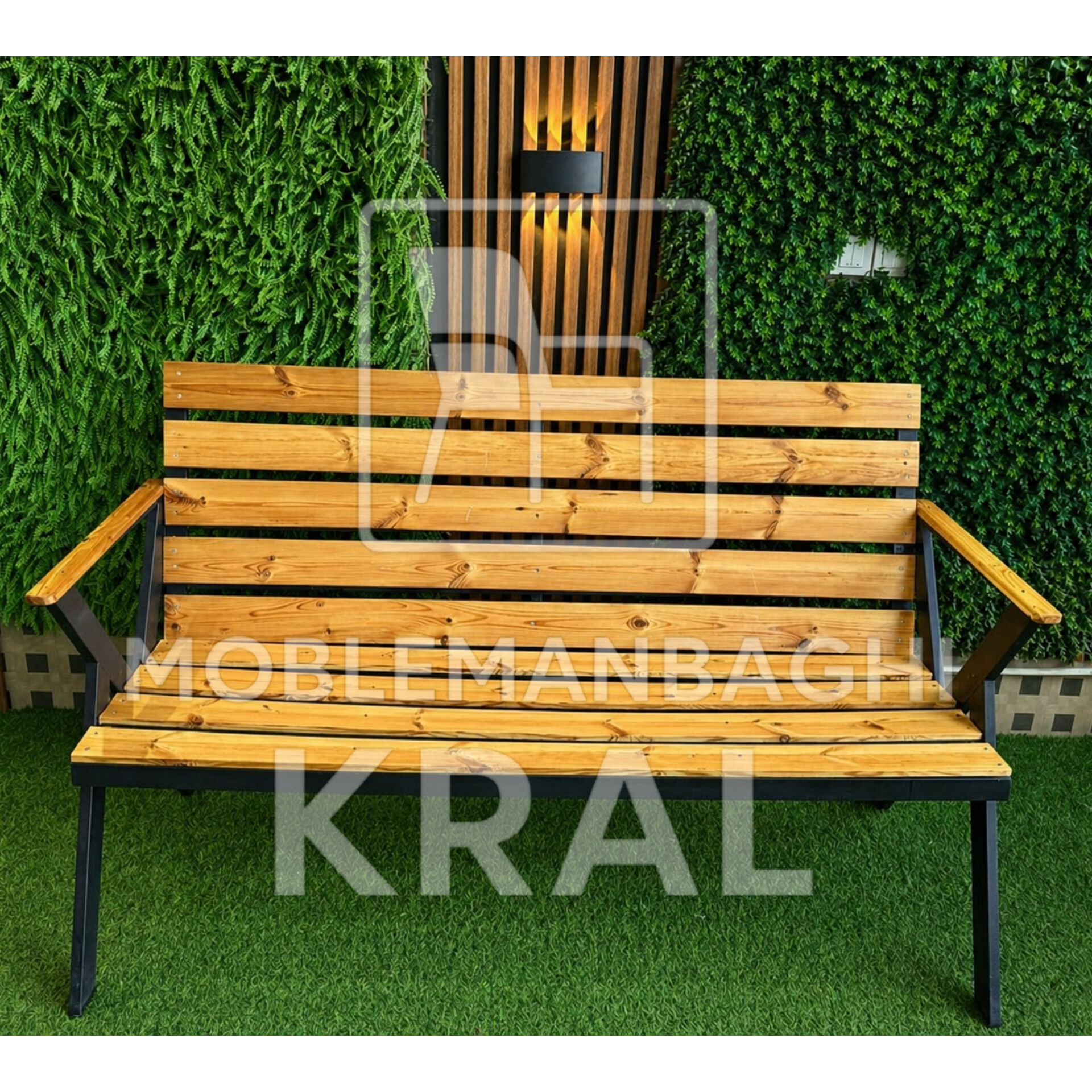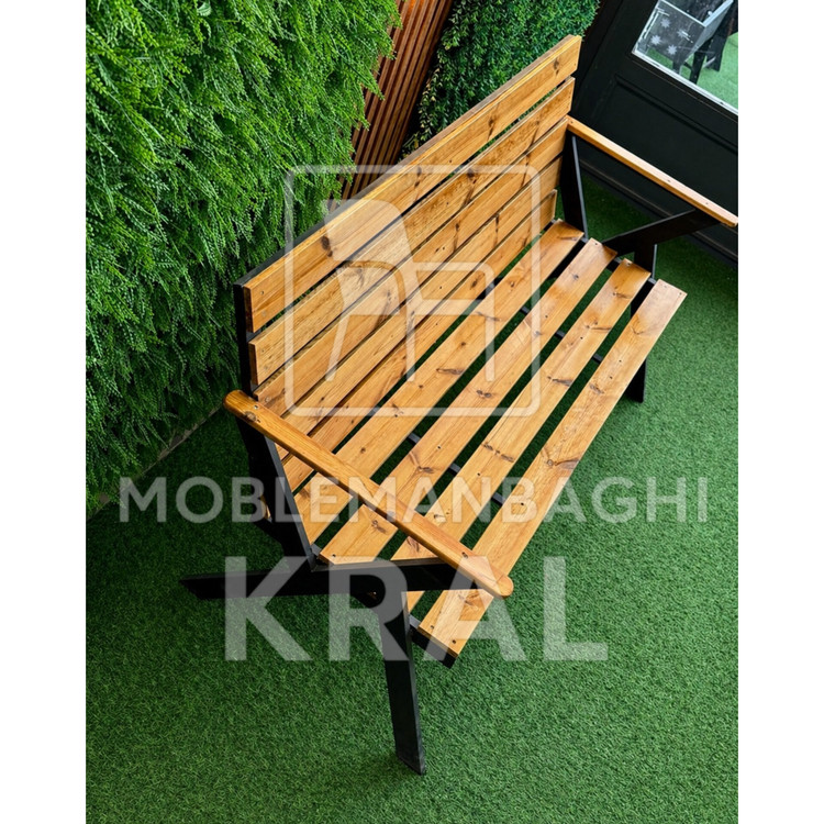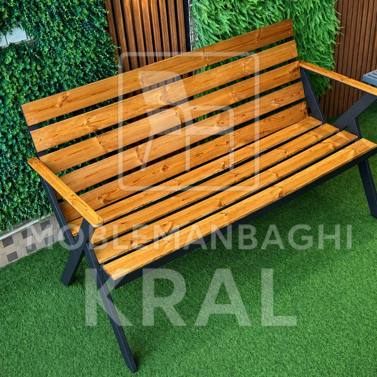 نیمکتی شیک، مقاوم و کاربردی با طراحی تلفیقی از چوب ترموو و فلز، مناسب برای فضای باز، حیاط، تراس، روفگاردن، ویلا، باغ و فضاهای دکوراتیو.